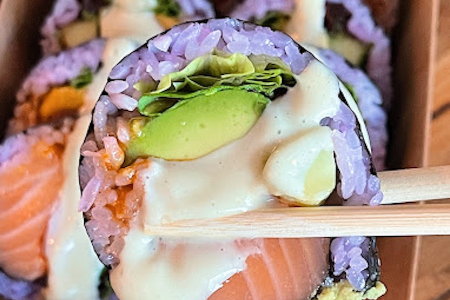 Salmon, spicy tuna, cucumber, avocado, spring mix, mango, wasabi mayonnaise sauce