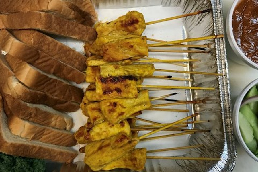 Marinated chicken skewered and grilled. Served with toasted bread, and a side order of peanut sauce and cucumber salad
