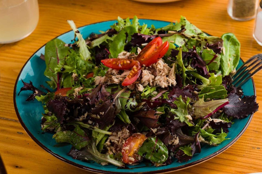 Mixed vegetables with italian tuna, organic onions, cherry tomatoes, extra virgin olive oil, and himalayan pink salt