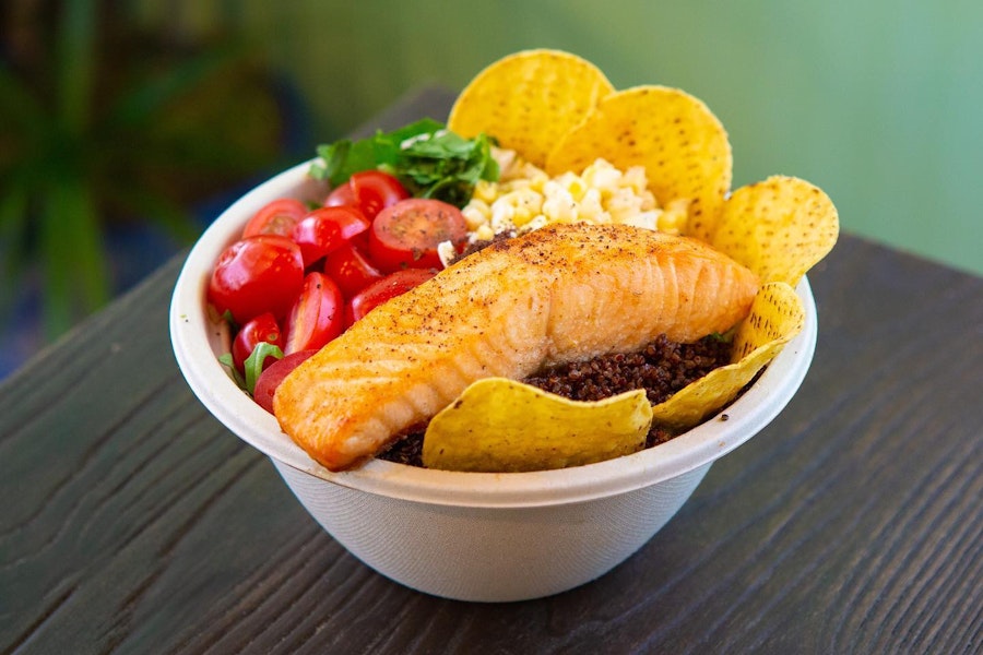 Organic arugula, warm quinoa, red onion, sumac, com, grape tomato, roasted salmon, cilantro, tortilla chips, hot sauce, lemon vinaigrette dressing,