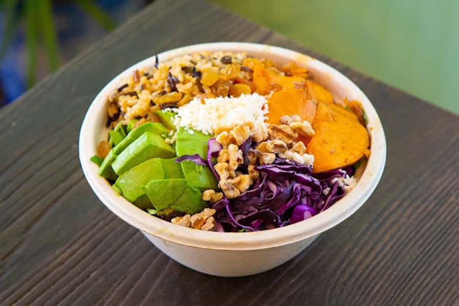 Organic arugula, brown & wild rice, roasted sweet potato, shredded purple cabbage, avocado, feta cheese, walnuts, raisins, balsamic vinaigrette