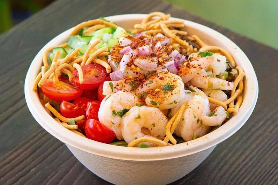 Organic arugula, organic mix spring, brown & wild rice, red onion, grape tomato, baja spice cucumber, red chili flakes, citrus shrimp, crispy noodle, thai cashew dressing