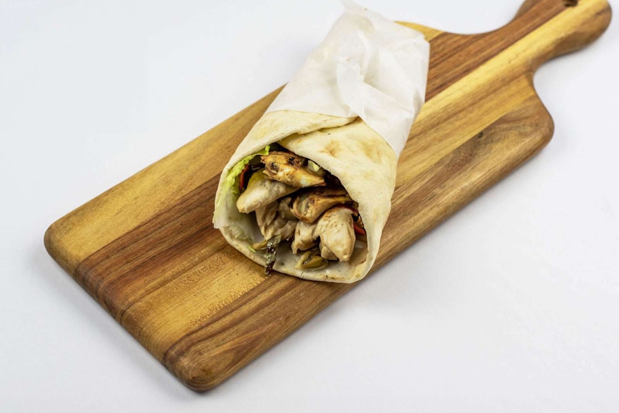 Chicken shawarma wrap filled with lettuce, tomato, and garlic sauce