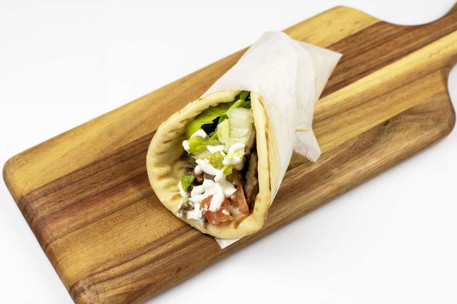 Gyro shawarma (beef and lamb) wrap filled with lettuce, tomato, and tzatziki sauce