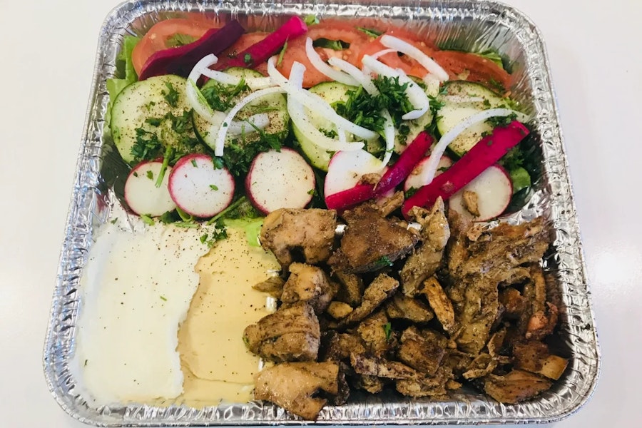 Strips of spit-roasted chicken, and crispy falafel (chickpea fritters)