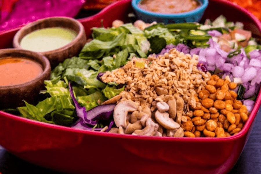 Caesar dressing with no anchovies with shredded paneer that is paired with a panamanian-style salsa and cilantro–garlic dressing