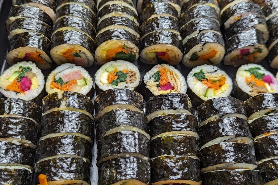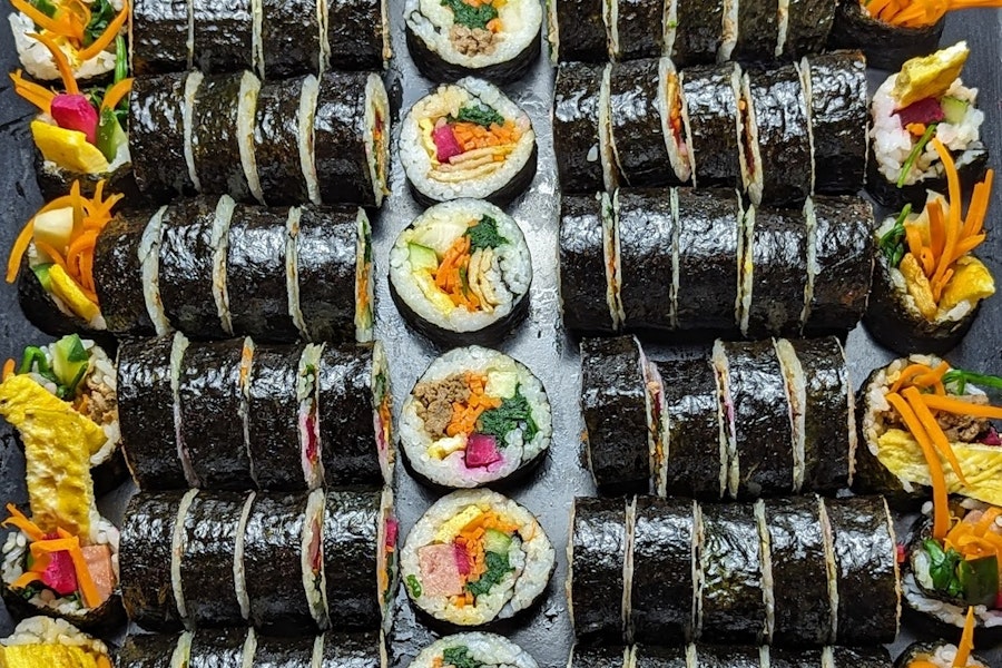 Korean rice roll with egg, marinated and cooked carrots & spinach, fresh cucumber, and grandma hami’s pickled radish - all wrapped in roasted seaweed