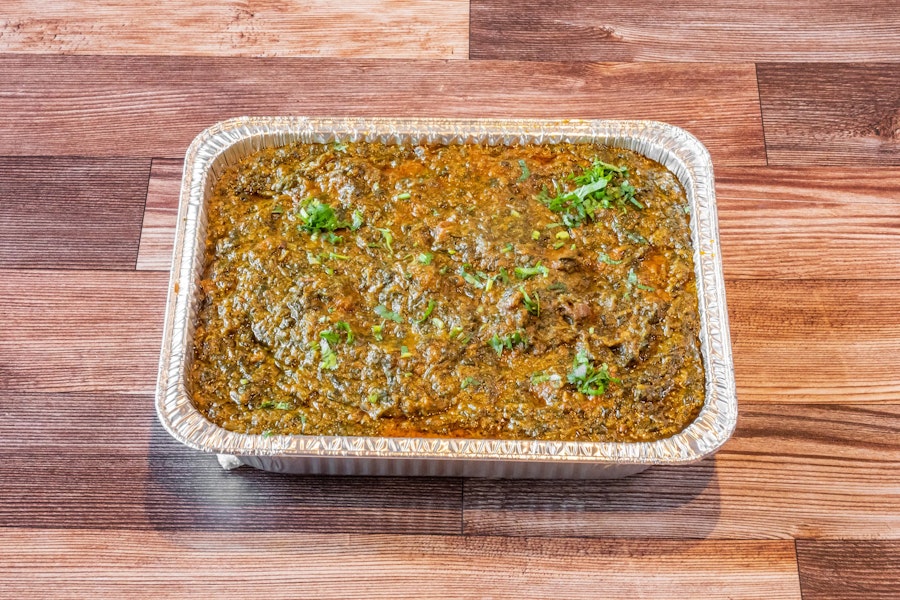 Tender, grass-fed lamb, slow-cooked in coarsely-chopped spinach and fenugreek