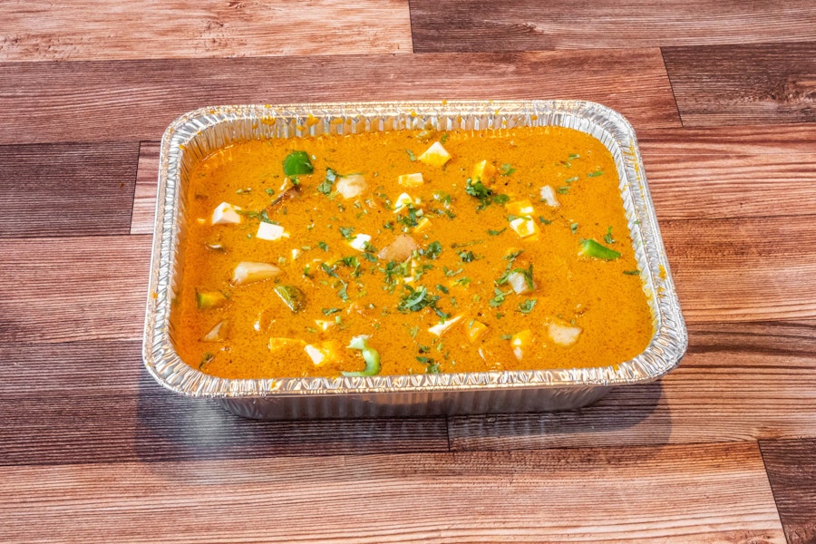 A hearty bowl of boneless chicken, carrots, potatoes, & peas cooked in madras curry spices and coconut milk
