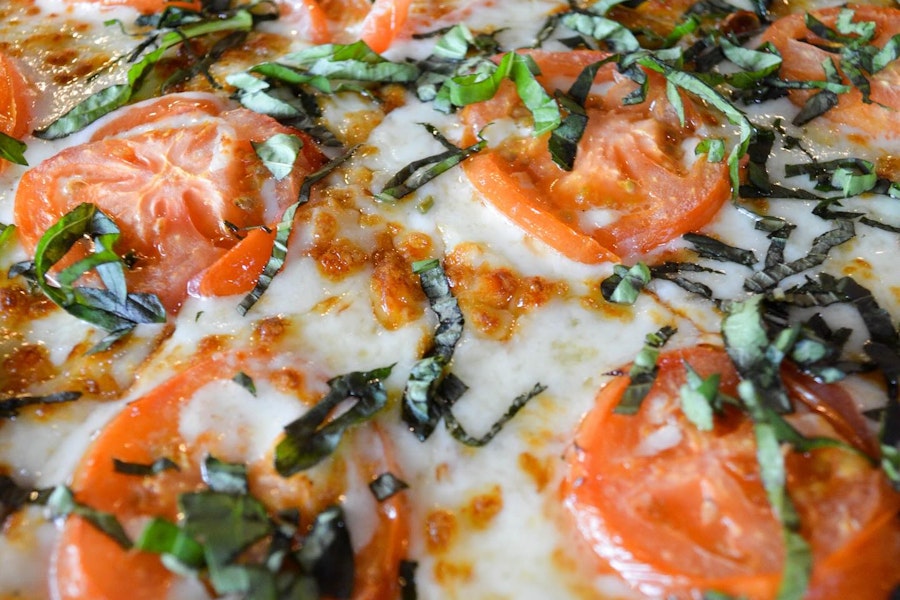 Our dave's fave sauce (olive oil, garlic & oregano) with sliced tomato and garlic spinach, topped with smoked provolone cheese