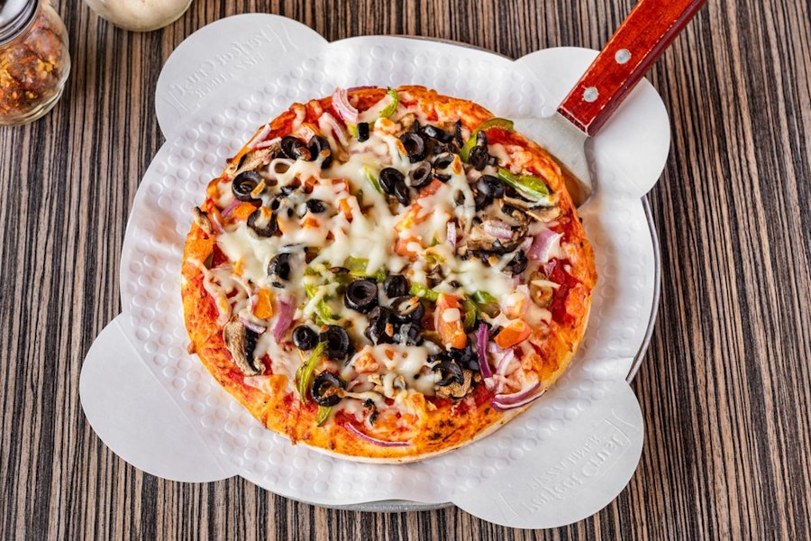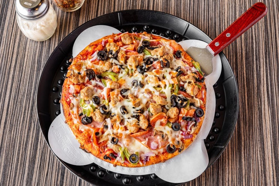 Vegan cheese, onions, olives, mushrooms, bell peppers, and tomatoes topped with fresh cilantro and green onion in red sauce