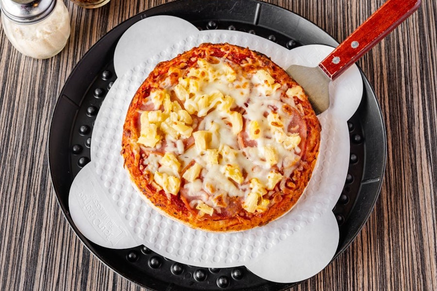 Spinach, red onions, pineapple, garlic, ginger, chopped green chili, jalapeños, mozzarella cheese and palak paneer, topped with green onions in masala sauce
