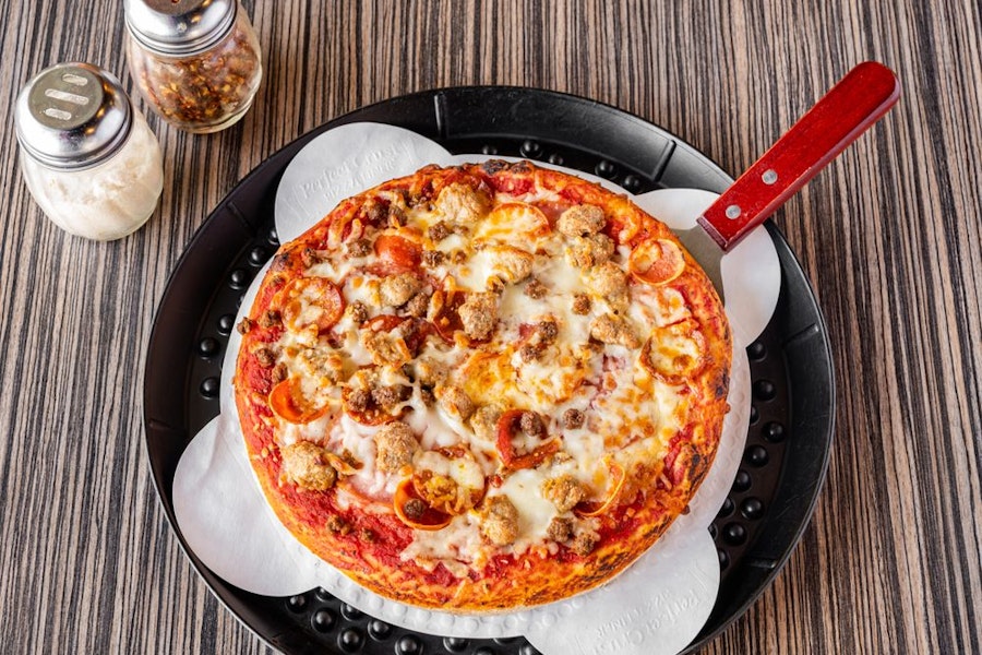 Pepperoni, red onions, bell peppers, mushrooms, tomatoes and italian garlic sausage in red sauce