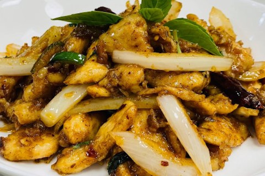Stir-fried chicken breast with mint leaves, garlic, and cilantro in house sauce