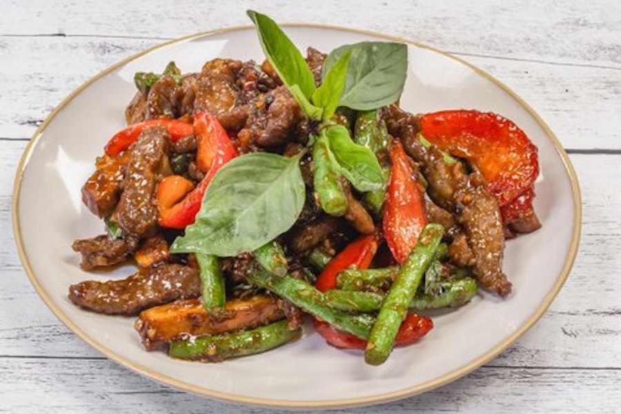 Stir-fried pork wok with snap peas, lemongrass purée, garlic, gluten-free soy sauce, red bell peppers, and basil