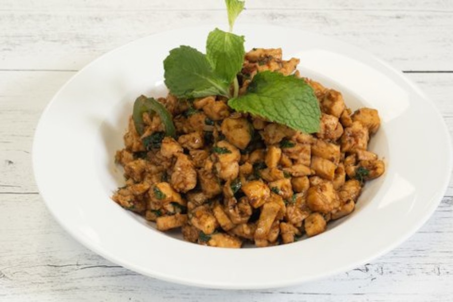 Stir-fried chicken breast with mint leaves, garlic, and cilantro in house sauce