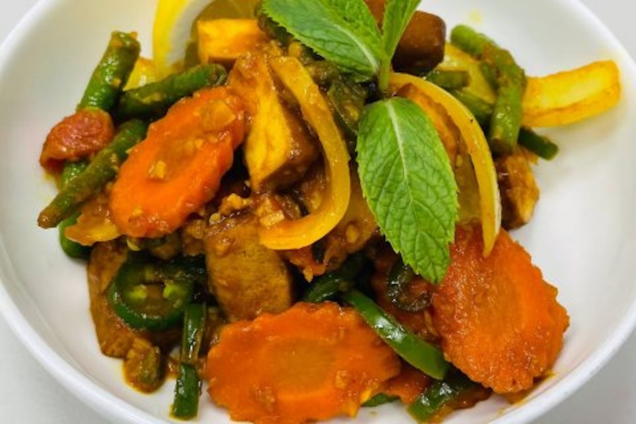Stir-fried vegetables & tofu wok with tomatoes, mint leaves, onions, garam masala powder, paprika powder, tamarind juice, and lemon wedges