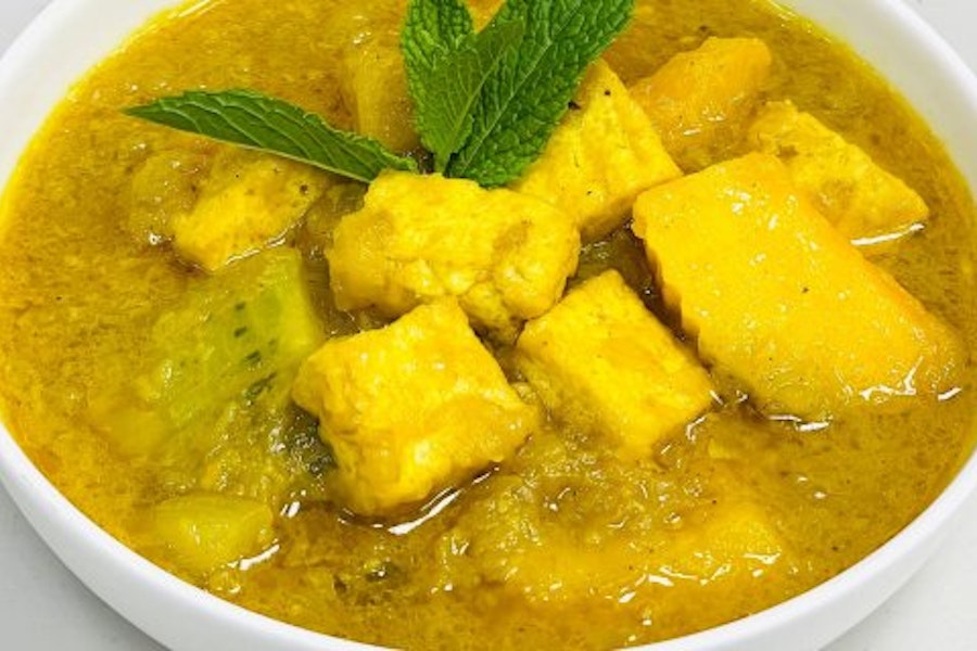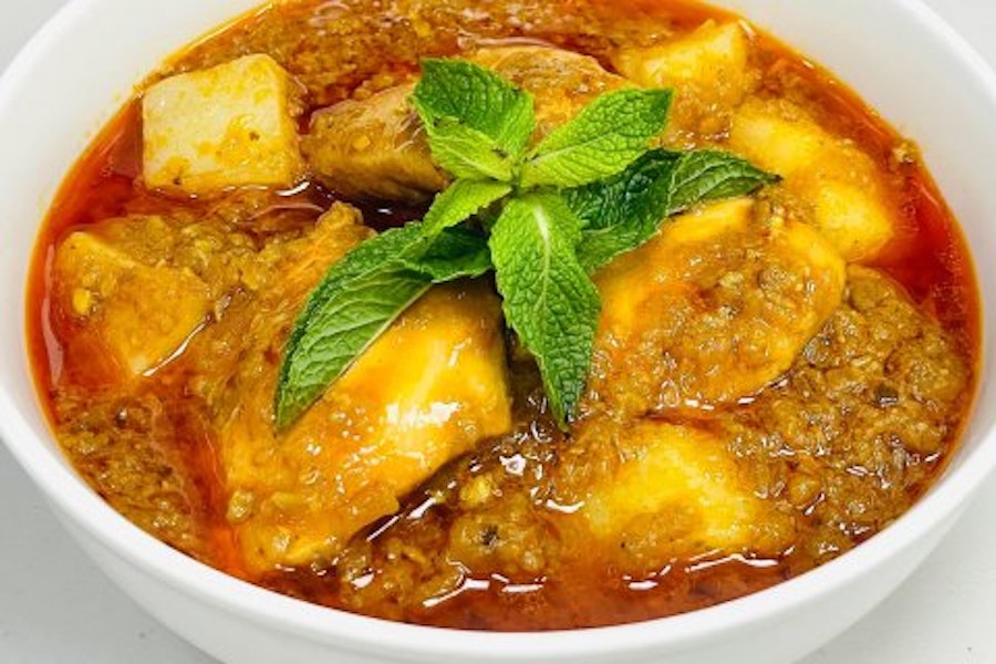 With garlic, onions, ginger, lemongrass, red chili, okra, and burmese spices