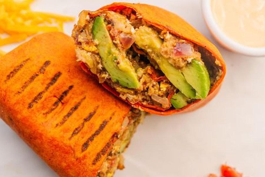 Vegan chorizo, mixed bell peppers, pico de gallo, avocado slices and shredded vegan cheese wrapped in a warmed tomato wrap