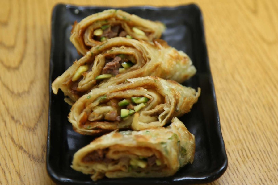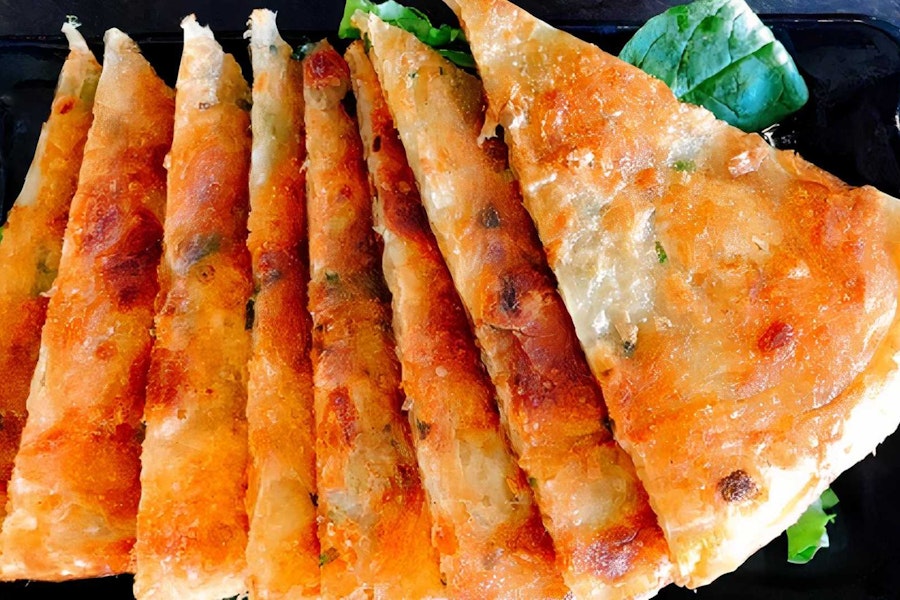 Pan-fried chive pocket pancake filled with chive, scrambled egg, and dry shrimp. Cut into 24 pieces