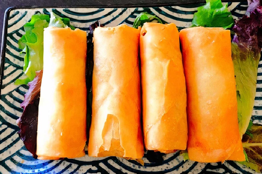 Crispy vegetarian spring rolls filled with cabbage, black fungus, carrots, vermicelli noodle and served with homemade spring sauce on the side
