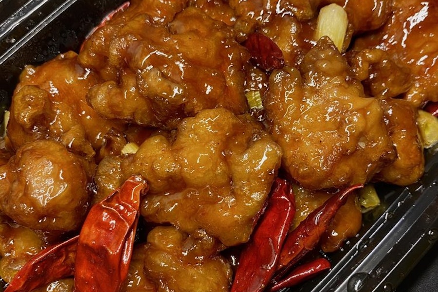 Crispy battered fried chicken coated in a tangy and sweet orange sauce