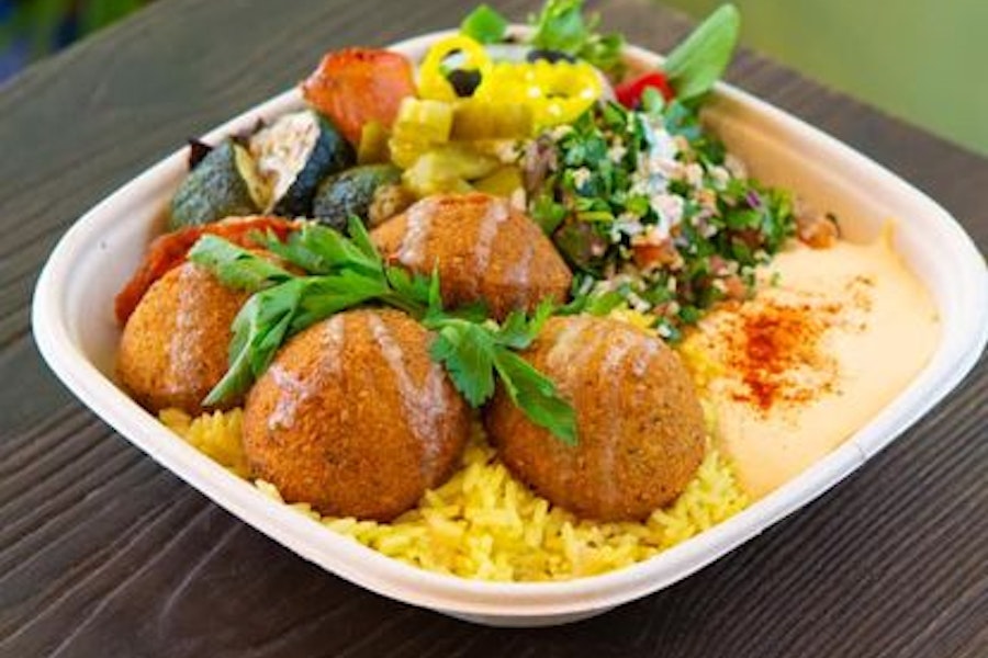 Greek rice, hummus, mix spring, tomato, onion, cucumber, falafel (contains gluten), greek fries, olive, classic tahini