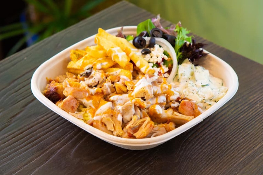 Greek rice, tzatziki, mix spring, tomato, onion, cucumber, grilled chicken, greek fries, feta, house greek sauce