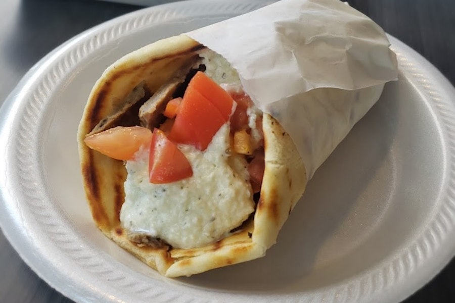 Sliced gyro meat (lamb and beef) with tomatoes and onions topped with tzatziki sauce