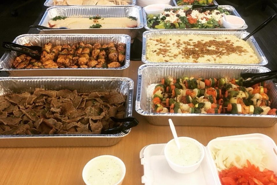 Includes 10 skewers, rice (topped with raisins and nuts), garlic sauce, and pita bread (pita bread is not gluten-free)