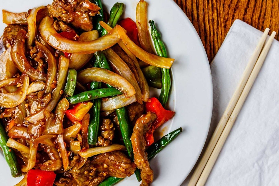 With egg, peas, carrots, green onions, and beef