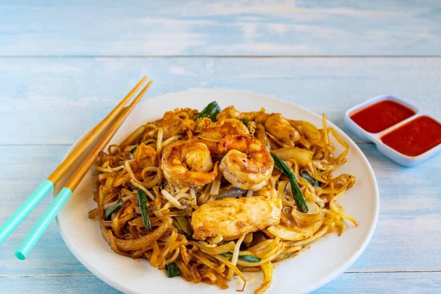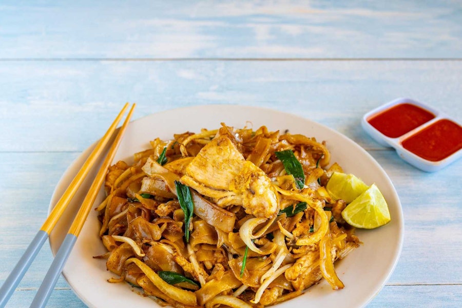 Stir-fried rice noodles with chicken, eggs, bean sprouts, scallions, and ground peanuts