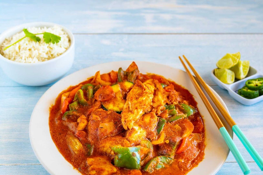 Chicken with carrots, white onions, bell peppers, and coconut milk