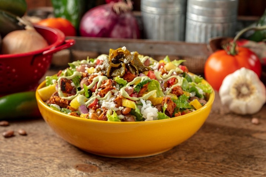 Rice, beans, romaine, pico, queso cheese, pineapple & lime dressing