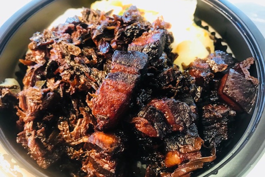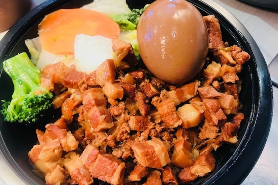 Braised pork belly and ground pork served over fresh white rice with stir-fried veggies, noodles and japanese pickles