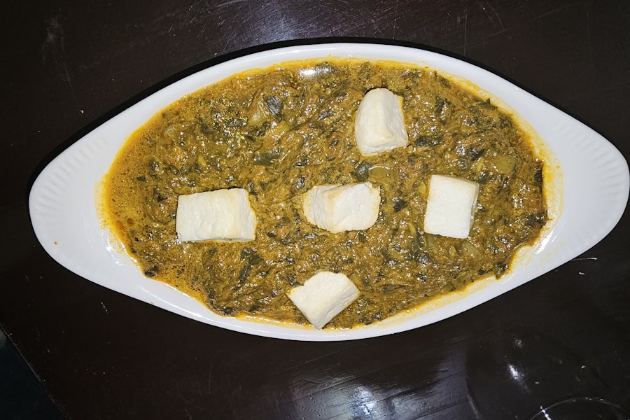 Creamy spinach curry cooked with cubes of paneer, seasoned with mild spices
