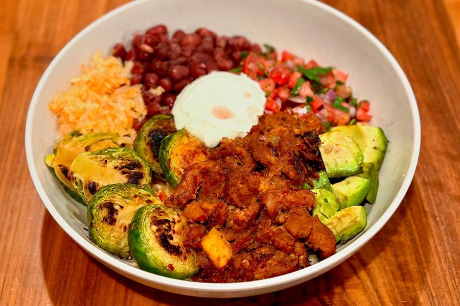 Choice of protein with mexican rice, black beans, slices of avocado, pico de gallo, and pineapple-glazed brussels sprouts with sour cream on the side (sour cream is not vegan)