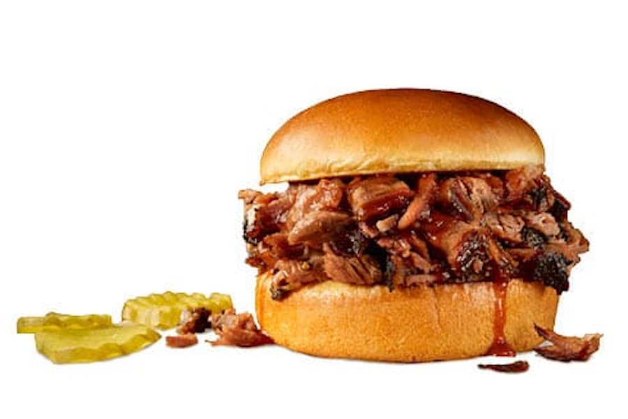 Indulge in our pitmaster's pride: succulent brisket that's been slow-smoked for 18 hours over hickory wood, with your choice of signature barbecue sauce, on a bun