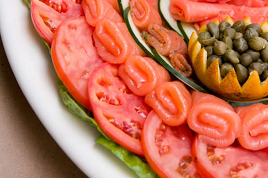 Thinly sliced imported smoked salmon attractively displayed with bermuda onions and sliced tomatoes, served with a tray of assorted bagels and cream cheeses