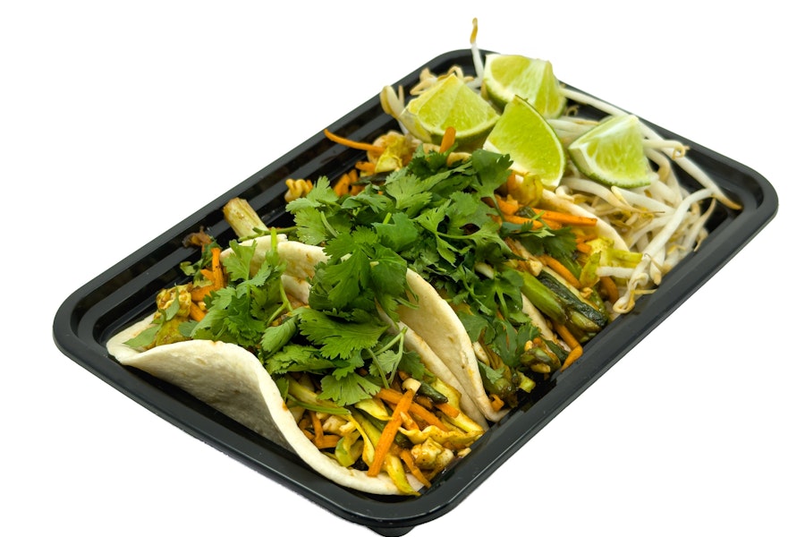 With vegan pad thai sauce, sautéed cabbage, shredded carrot, green onion, bean sprouts, lime, and cilantro in flour tortillas