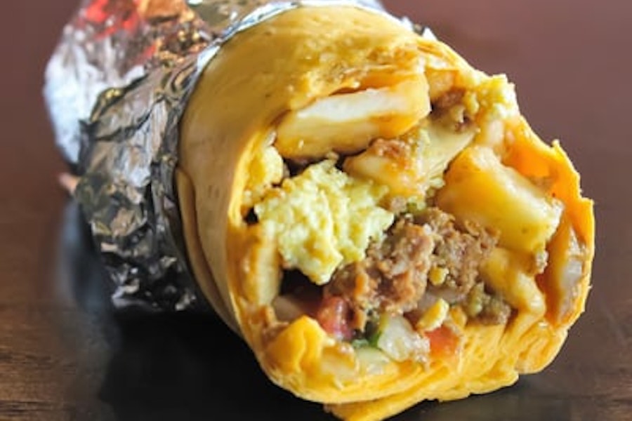 All breakfast burritos come with your choice of tortilla, cheese, scrambled eggs, crispy potatoes and your choice of meat, toppings and salsa
