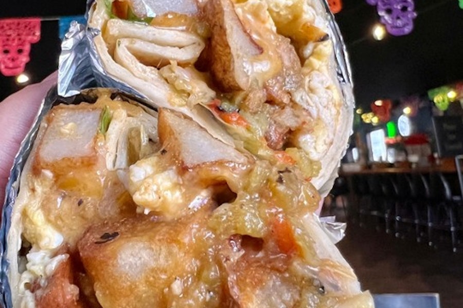 Scrambled egg, smoked potato, green chile, cheese, flour tortilla
