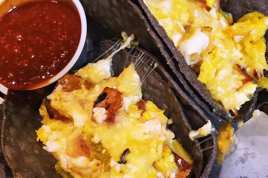 6" blue corn tortillas, scrambled egg, smoked potato, cheese, salsa