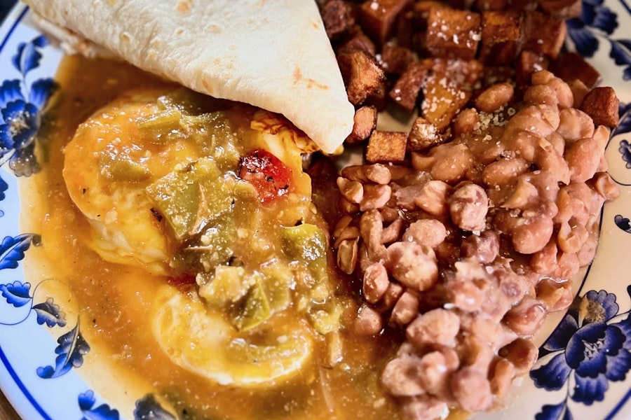 Eggs, smoked potato, beans, green chile, flour tortilla