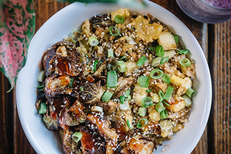 Crispy juicy slab of pork belly over jasmine rice with fried egg, sweet chile, tamari, green onion