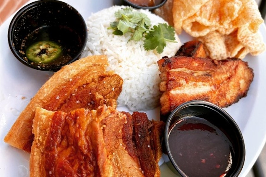 Lechon kawali, smoked pork belly, chicharron crisps, jasmine rice, green onion, sesame seeds with sweet chile, spicy vinegar and mango habanero dipping sauces