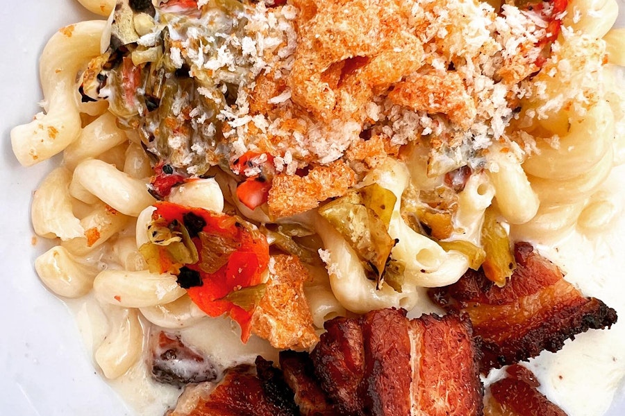 Creamy queso blanco over cavatappi noodles with diced hatch green chile, pork belly, panko-chicharron