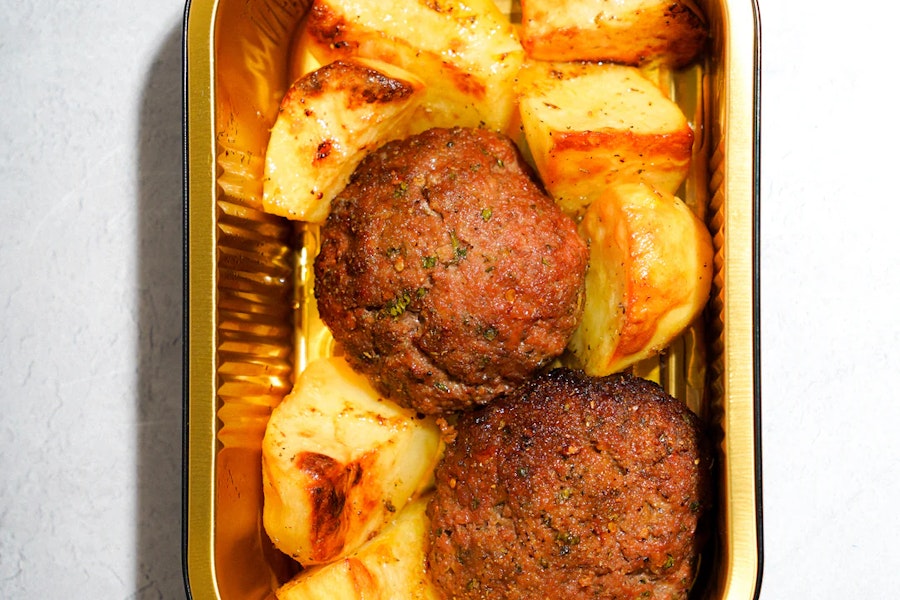 Two of our handcrafted biftekia, made with premium grass-fed ground beef, fresh parsley, garlic, onion, and mediterranean herbs, baked to golden perfection. Paired with a side of our signature greek lemon potatoes—yukon golds roasted with fresh lemon juice, cold-pressed olive oil, and fragrant oregano