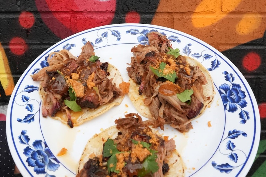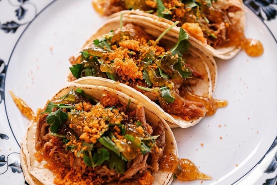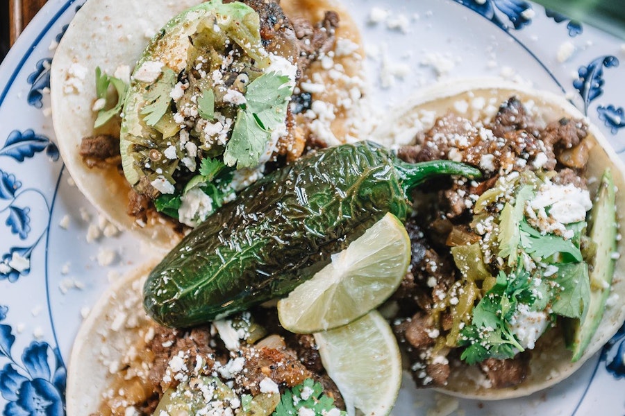 Each taco box contains three of the same taco type served on corn tortillas with jalapeno & lime