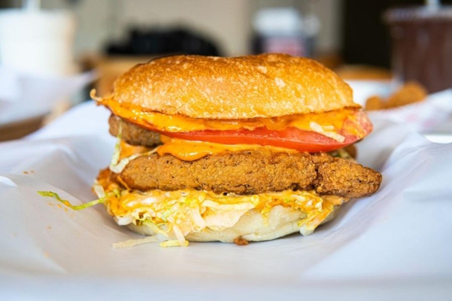 Crispy plant-based patty topped with vegan peri-peri sauce, lettuce, and tomato